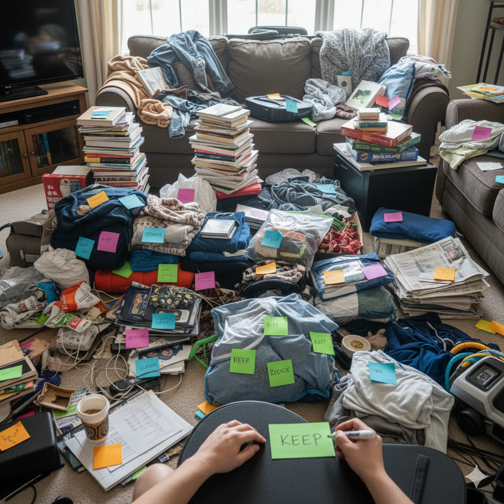 - Tag Team Tagging: Slap those sticky notes on EVERYTHING. Each item should have a sticky note with either: "Keep”, "Donate”, "Storage”, "Recycle”, or the dreaded "Trash". NOTE: If you can’t decide, put it in a “storage” pile.